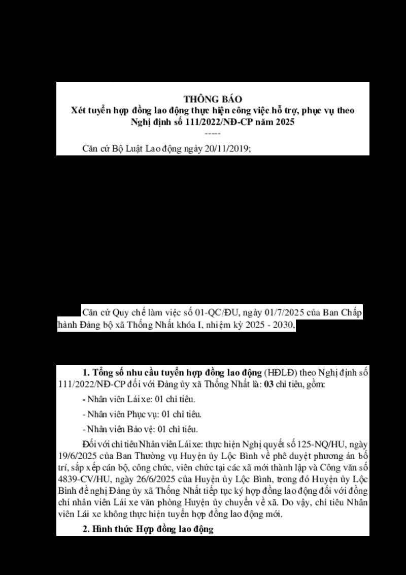 | Tiêu đề văn bản | THÔNG BÁO Xét tuyển hợp đồng lao động thực hiện công việc hỗ trợ, phục vụ theo Nghị định số 111/2022/NĐ-CP năm 2025 | ||