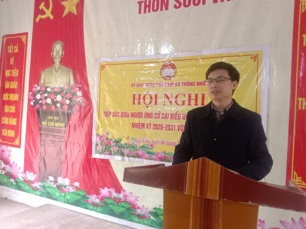 Từ ngày 03/3 đến ngày 06/3/2026 các đồng chí ứng cử viên đại biểu Hội đồng nhân dân khóa III nhiệm kỳ 2026-2031 tại đơn vị bầu cử số 05 gồm: Ông Vi văn Thắng, Phó bí thư Đảng uỷ, Chủ tịch UBND xã; Ông Vy Văn Thái, Chỉ huy Trưởng Ban chỉ huy quân sự xã; Ông Nông Văn Ngọc, Chánh văn phòng HĐND và UBND xã; Ông Vy Văn Thuỵ, Phó Trưởng Ban xây dựng Đảng; Bà Trần Thị Liễu, Trường PTDT bán trú THCS Hữu Lân; Bà Trương Thị Hương, thôn Hợp Tiến, xã Thống Nhất; Ông Vy Văn Tọt, thôn Hợp Tiến, xã Thống Nhất, đã tiếp xúc cử tri với 06 thôn: Vinh Tiên, Suối Vằm, Suối Lông, Thôn Bộ, Suối Mỉ đã thành công tốt đẹp.