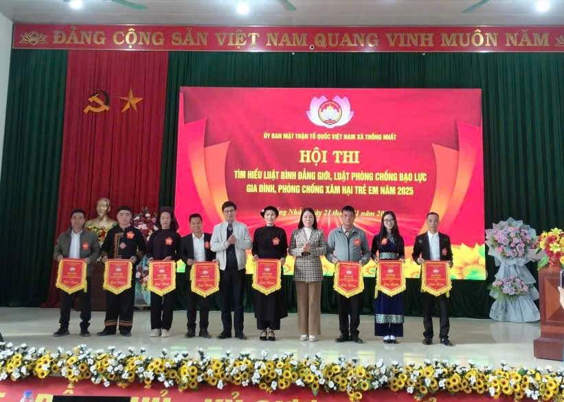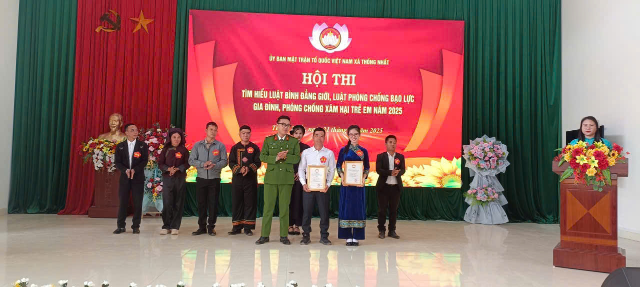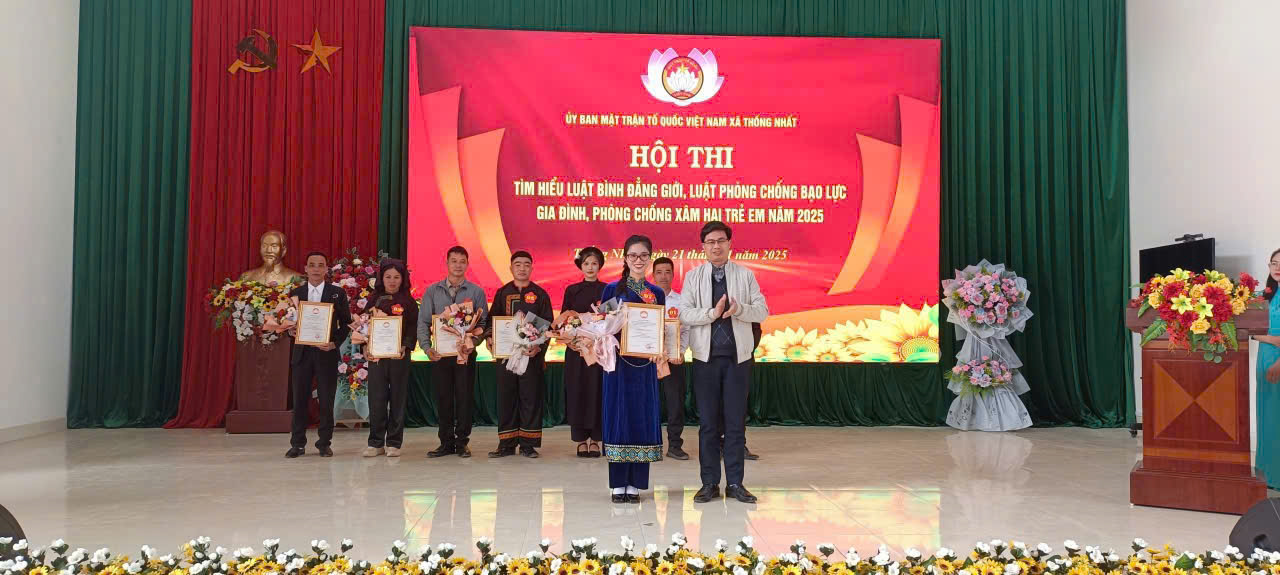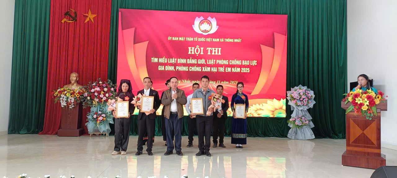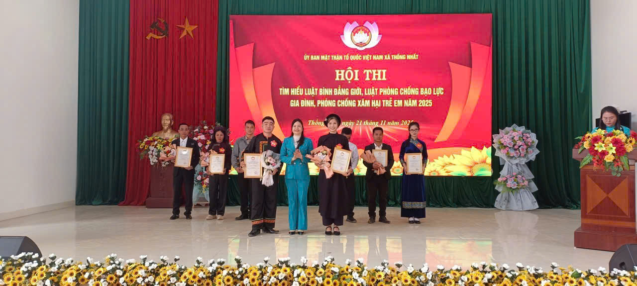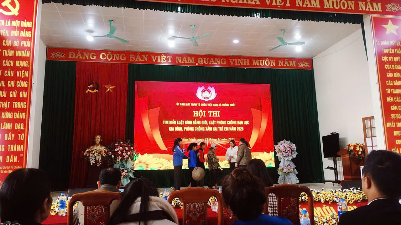 Ngày 21/11/2025, Uỷ ban Mặt trận Tổ quốc Việt Nam xã Thống Nhất tổ chức Hội thi “Tìm hiểu Luật Bình đẳng giới, Luật Phòng chống bạo lực gia đình và phòng chống xâm hại trẻ em năm 2025”. Dự và động viên hội thi có đồng chí Lý Thị Thủy - Bí thư Đảng ủy, Chủ tịch HĐND xã; đồng chí Vi Văn Thắng - Phó Bí thư Đảng ủy, Chủ tịch UBND xã, các đồng chí Ban Thường trực Ủy ban MTTQ Việt Nam xã, trưởng các tổ chức chính trị xã hội, công an xã và các đồng chí trong Ban tổ chức; Ban giám khảo, Tổ thư ký Hội thi; 08 đội thi đến từ 08 thôn trên địa bàn xã Thống Nhất.