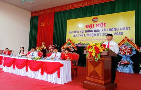 Phát biểu chỉ đạo tại Đại hội, đồng chí Lý Thị Thủy, Bí thư Đảng ủy xã; Đã ghi nhận và biểu dương thành tích đạt được của Hội Nông dân xã Thống Nhất trong thời gian qua. Đồng chí đề nghị trong nhiệm kỳ mới, Hội cần tiếp tục đẩy mạnh tuyên truyền, triển khai có hiệu quả các nghị quyết, chương trình hành động; Đổi mới nội dung, phương thức hoạt động, nâng cao chất lượng các phong trào thi đua, hỗ trợ hội viên về vốn, khoa học, kỹ thuật ứng dụng công nghệ, thúc đẩy phát triển nông nghiệp sạch. Trong đó đẩy mạnh chuyển đổi số trong nông nghiệp, kết nối tiêu thụ sản phẩm, khuyến khích hội viên ứng dụng khoa học kỹ thuật, chuyển đổi cơ cấu cây trồng vật nuôi theo hướng hàng hoá; Đẩy mạnh các phong trào thi đua yêu nước, phong trào nông dân sản xuất kinh doanh giỏi, đoàn kết giúp nhau giảm nghèo làm giàu bền vững.