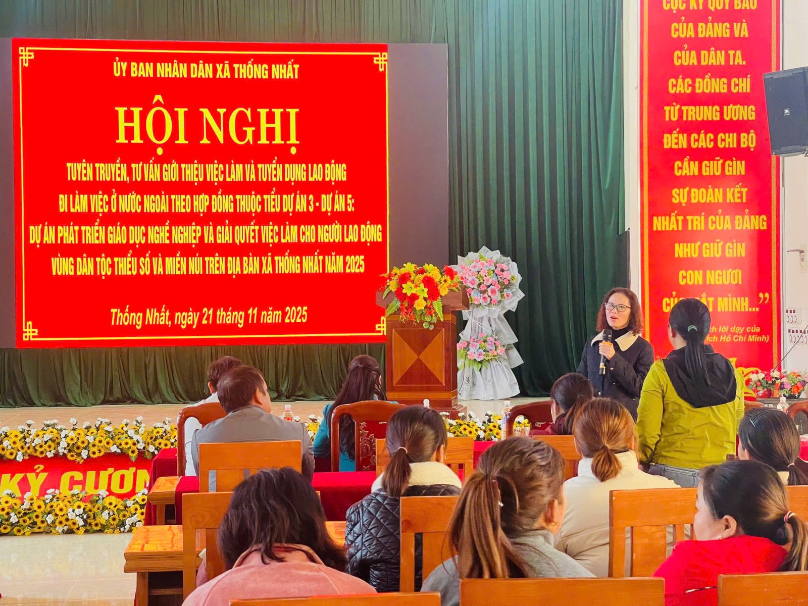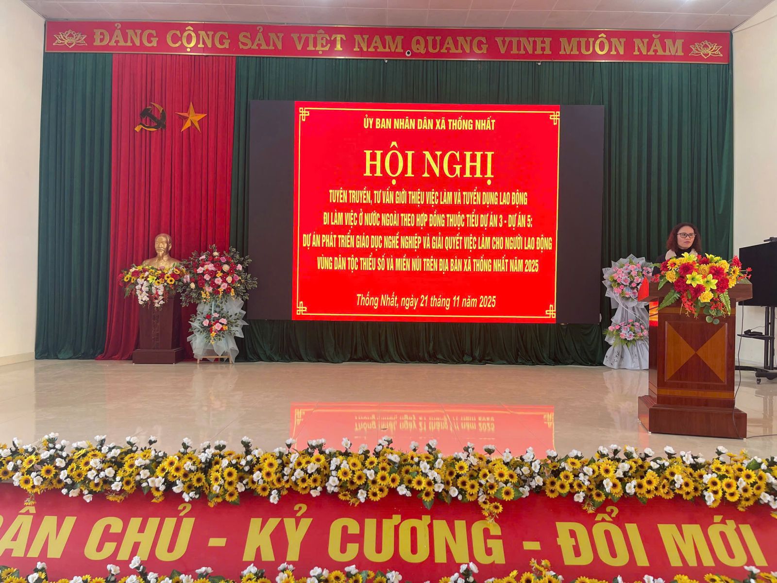 Thực hiện Kế hoạch số 59/KH-VHXH ngày 19/11/2025 của UBND xã Thống Nhất về việc tổ chức hội nghị tuyên truyền, tư vấn giới thiệu việc làm và tuyển dụng lao động đi làm việc ở nước ngoài theo hợp đồng thuộc Tiểu dự án 3 – Dự án 5: Phát triển giáo dục nghề nghiệp và giải quyết việc làm cho người lao động vùng dân tộc thiểu số và miền núi năm 2025, chiều ngày 21/11/2025 tại Hội trường Nhà văn hóa xã, UBND xã Thống Nhất phối hợp với Sở Nội vụ tỉnh Lạng Sơn tổ chức khai mạc hội nghị.