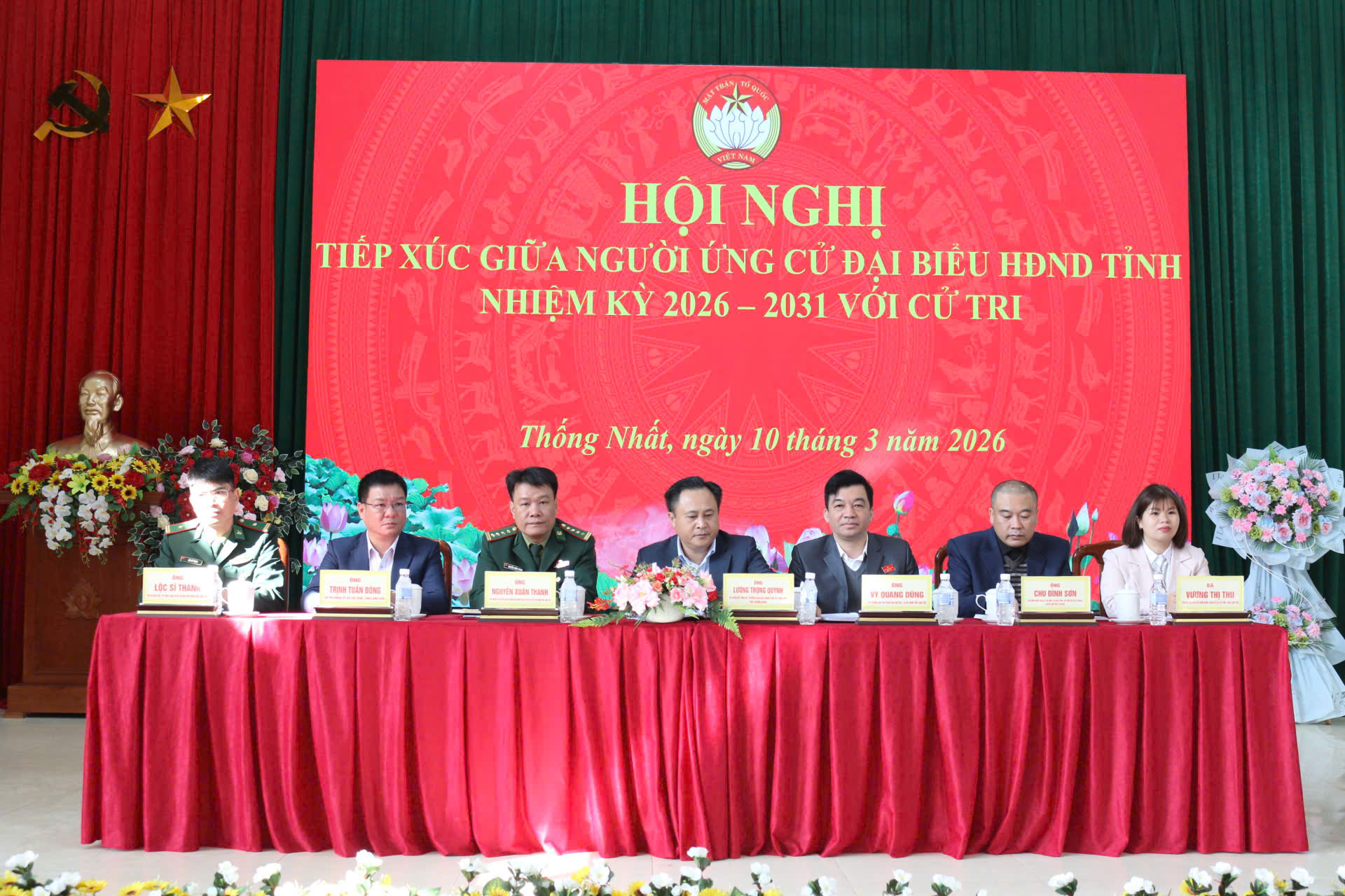 Sáng 10/3/2026, Các ứng cử viên đại biểu HĐND tỉnh nhiệm kỳ 2026 -2031 thuộc đợn vị bầu cử số 4 đã tiếp xúc cử tri vận động bầu cử tại xã Thống Nhất. Các ứng cử viên gồm: Bà Đoàn Thu Hà, Phó Bí thư Tỉnh uỷ, Chủ tịch Uỷ ban MTTQ Việt Nam tỉnh; Ông Lương Trọng Quỳnh, Uỷ viên Ban Thường vụ Tỉnh uỷ, Trưởng Ban Nội chính Tỉnh uỷ; Ông Nguyễn Xuân Thanh, Uỷ viên Ban Thường vụ Đảng uỷ Quân sự tỉnh, Bí thư Đảng uỷ, Ban Chỉ huy Bộ đội Biên Phòng, Phó Chính uỷ Bộ Chỉ huy Quân sự tỉnh Lạng Sơn kiêm Chính uỷ Ban Chỉ huy Bộ đội Biên phòng; Ông Lộc Sỹ Thanh, Uỷ viên Bộ Chính trị, Bí thư Trung ương Đảng, Chủ nhiệm Uỷ ban Kiểm tra Trung ương; Ông Vy Quang Dũng, Phó Trưởng ban phụ trách Ban Văn hoá - Xã hội, HĐND tỉnh; Ông Trịnh Tuấn Đông, Bí thư Đảng uỷ, Chủ tịch HĐND xã Lộc Bình; Ông Chu Đình Sơn, Phó Trưởng phòng theo dõi công tác Nội chính - Cải cách tư pháp - Tiếp công dân và xử lý đơn thư; Bà Vương Thị Thu, Chuyên viên Ban xây dựng Đảng, Đảng uỷ xã Lộc Bình.
