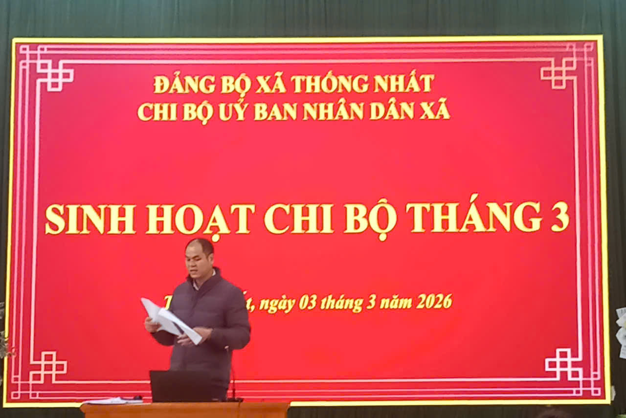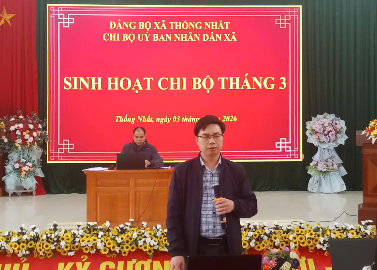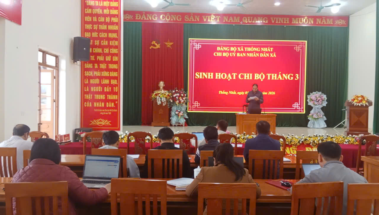 Ngày 03 tháng 3 năm 2026, Chi bộ Ủy ban nhân dân xã Thống Nhất tổ chức sinh hoạt định kỳ tháng 03/2026 và triển khai phương hướng, nhiệm vụ trọng tâm tháng 04 năm 2026. Đồng chí Vi Văn Tô - Phó Chủ tịch UBND xã, Bí thư Chi bộ chủ trì buổi sinh hoạt.