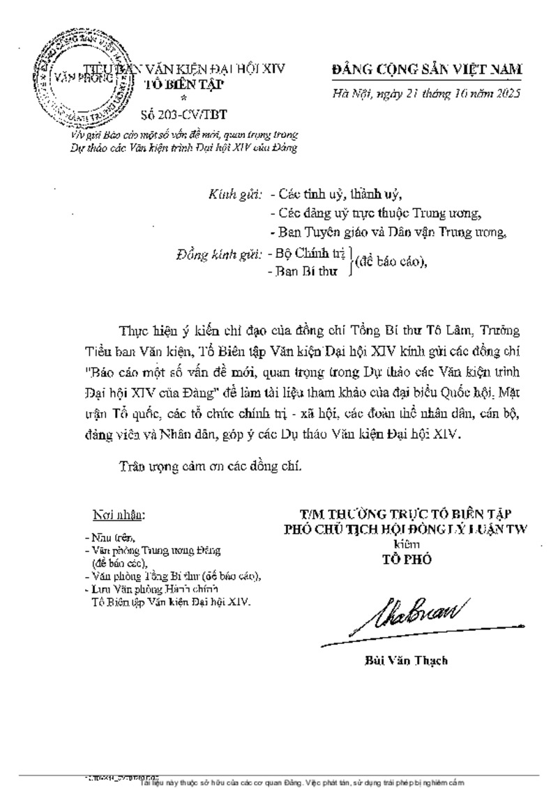 | Tiêu đề văn bản | Báo cáo một số vấn đề mới, quan trọng trong Dự thảo các Văn kiện trình Đại hội XIV của Đảng | ||
