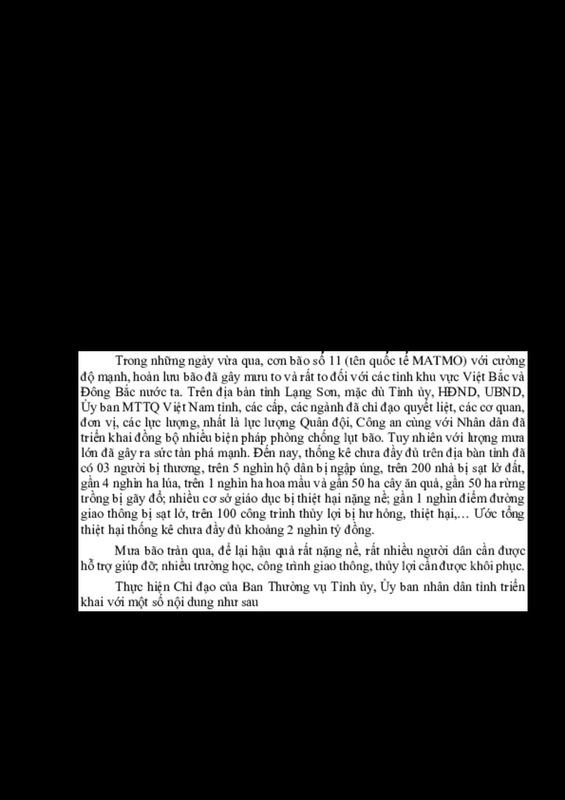 | Tiêu đề văn bản | Công văn về việc phát động quyên góp ủng hộ nhân dân bị ảnh hưởng của cơn bão số 11 (MATMO) trên địa bàn tỉnh | ||