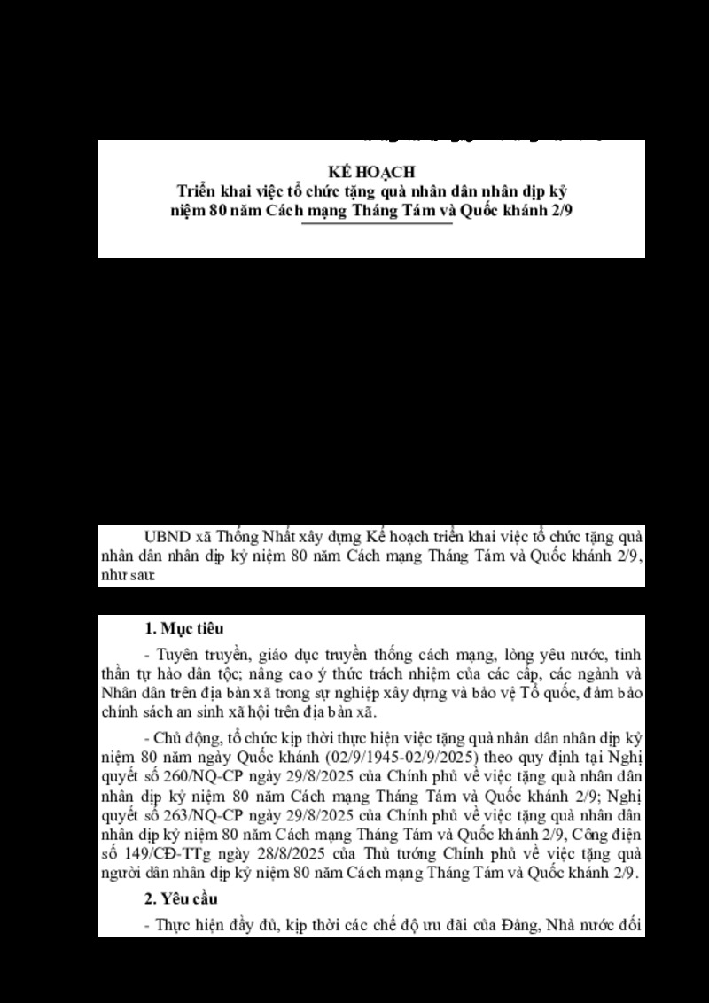 | Tiêu đề văn bản | KẾ HOẠCH Triển khai việc tổ chức tặng quà nhân dân nhân dịp kỷ niệm 80 năm Cách mạng Tháng Tám và Quốc khánh 2/9 | ||