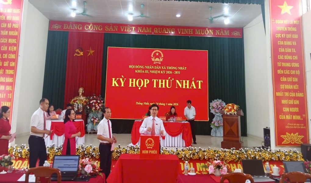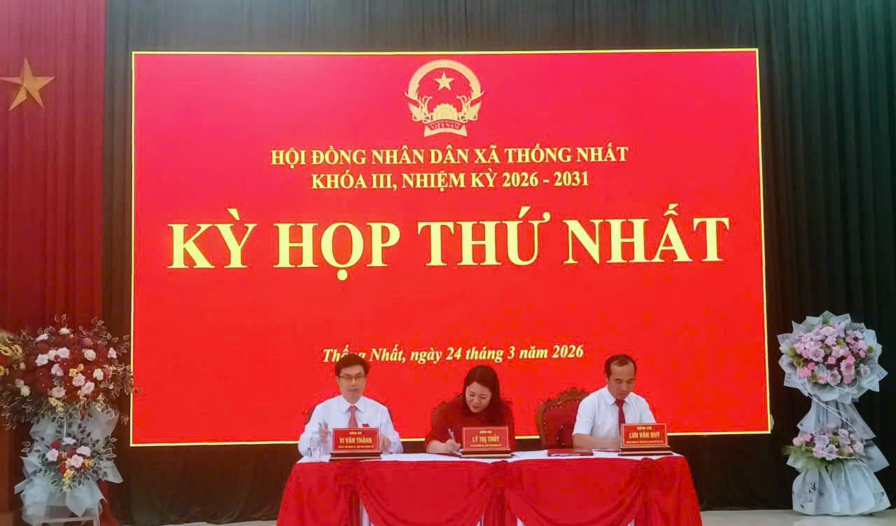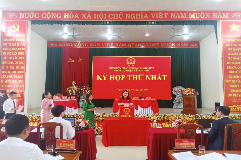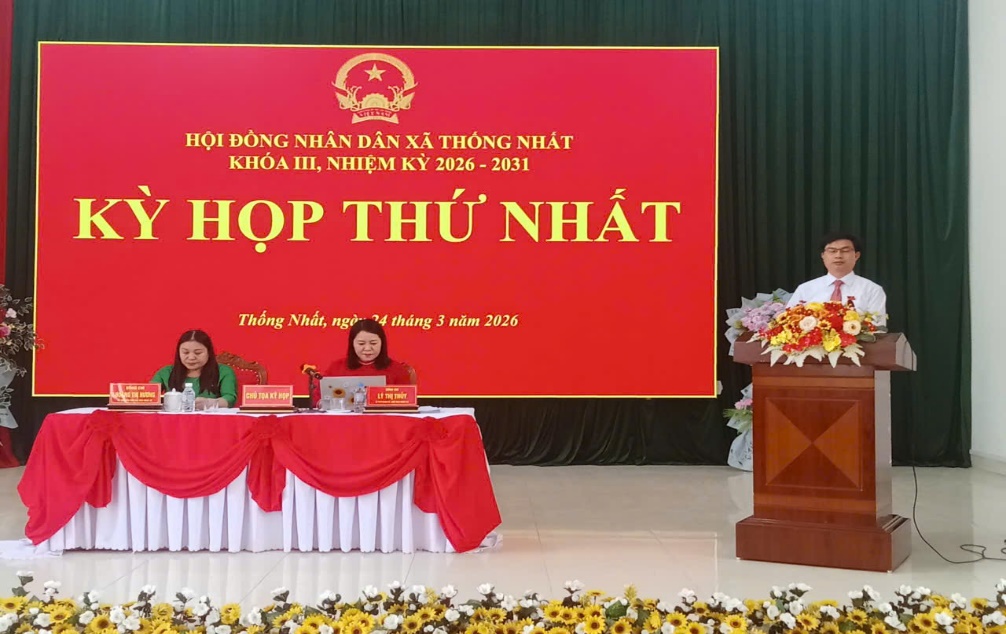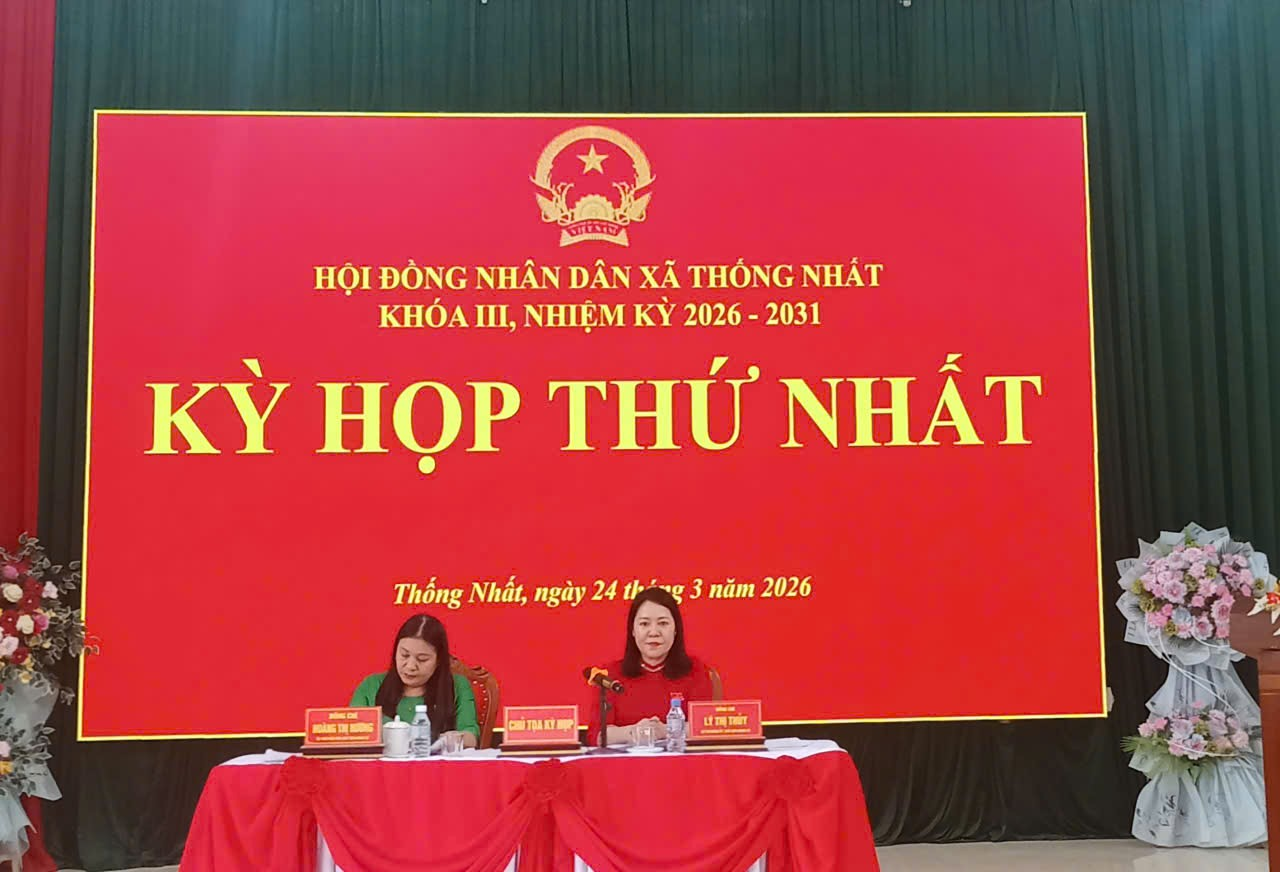 Chiều ngày 24/3/2026, HĐND xã Thống Nhất tổ chức kỳ họp thứ Nhất HĐND xã Khóa III, nhiệm kỳ 2026 - 2031. Đây là kỳ họp có ý nghĩa quyết định việc kiện toàn tổ chức bộ máy và định hướng hoạt động của xã trong cả nhiệm kỳ. Đồng chí Lý Thị Thuỷ - Bí thư Đảng ủy, Chủ tịch HĐND xã và Đồng chí Hoàng Thị Hương - phó chủ tịch HĐND xã chủ trì kỳ họp. Tham dự kỳ họp có các đồng chí Thường trực HĐND, lãnh đạo UBND, Ủy ban MTTQ xã, lãnh đạo các ban ngành, đoàn thể xã và 21 đại biểu HĐND xã khóa III nhiệm kỳ 2026 - 2031.