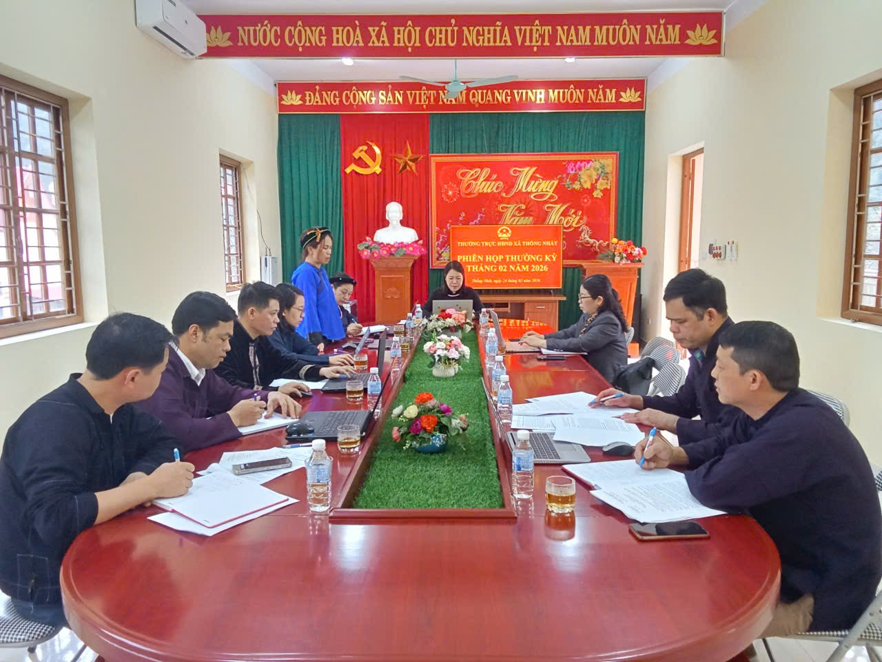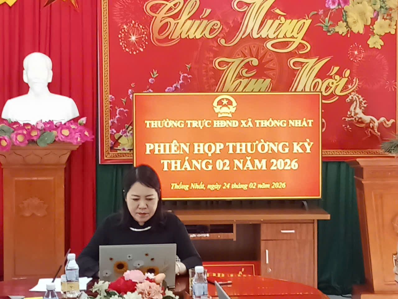 Ngày 24 tháng 02 năm 2026, Thường trực HĐND xã Thống Nhất tổ chức phiên họp Thường trực HĐND xã tháng 02 nhiệm vụ trọng tâm tháng 03 năm 2026. Dự có đồng chí Lý Thị Thuỷ, Bí thư Đảng uỷ, Chủ tịch HĐND xã chủ trì phiên họp. Tham dự có các thành viên Thường trực HĐND xã, đại diện lãnh đạo UBND xã, đại diện Ban Thường trực Ủy ban MTTQ xã; Trưởng, phó ban các Ban HĐND xã; Lãnh đạo và chuyên viên Văn phòng HĐND và UBND xã