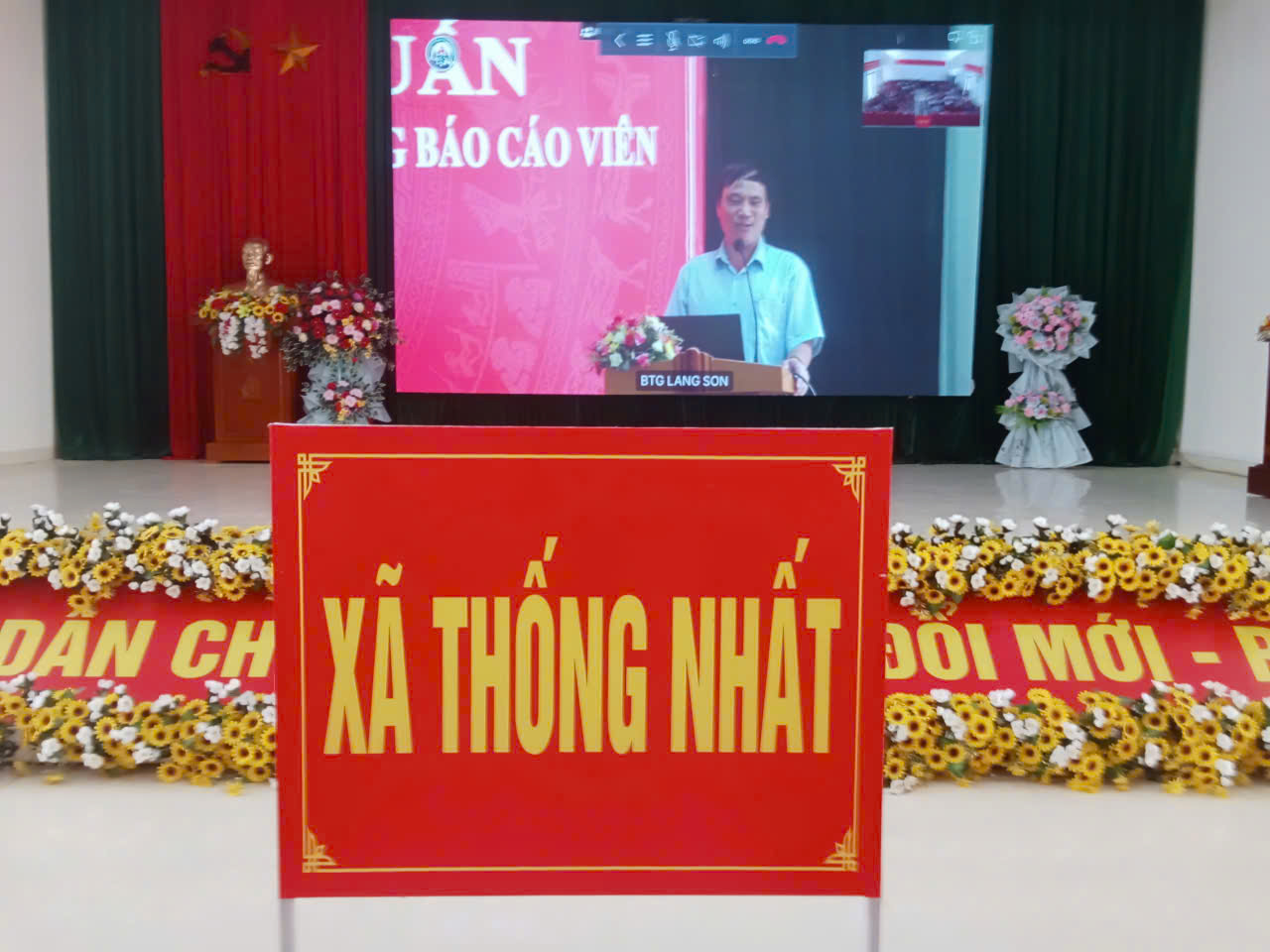 Các đại biểu dự hội nghị tại điểm cầu xã Thống Nhất có Thường trực Đảng ủy, các đồng chí Ủy viên Ban Thường vụ Đảng uỷ, Ủy viên Ban Chấp hành Đảng bộ xã, các đồng chí báo cáo viên, tuyên truyền viên cấp xã, lãnh đạo và chuyên viên phụ trách tham mưu công tác báo cáo viên, tuyên truyền miệng của ban Xây dựng Đảng.