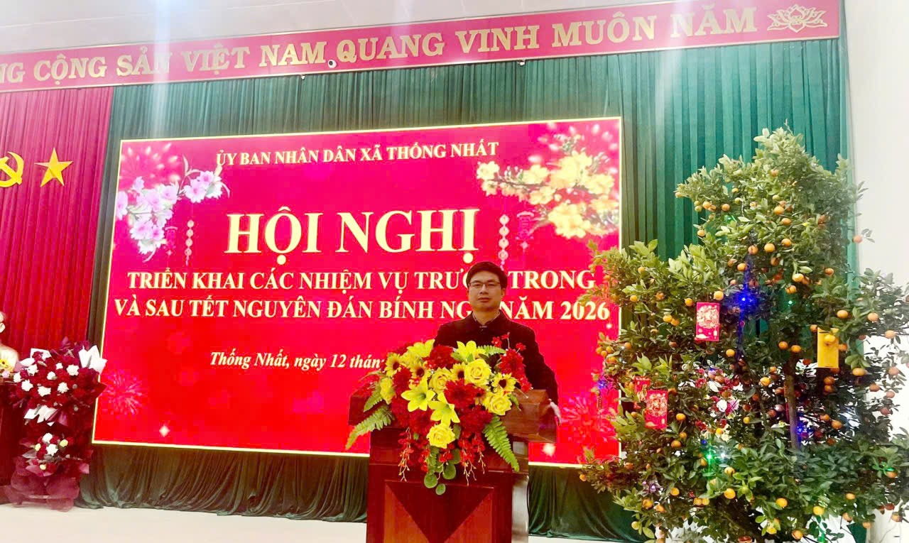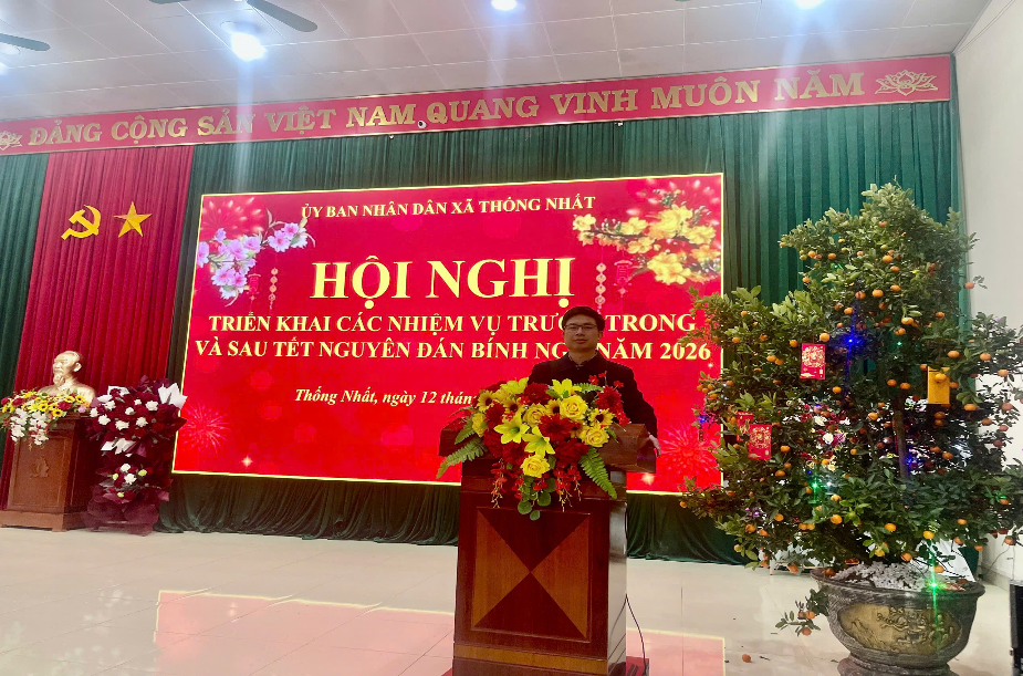 Chiều 12/2/2026, UBND xã Thống Nhất tổ chức Hội nghị triển khai nhiệm vụ trước, trong và sau Tết Nguyên đán Bính Ngọ năm 2026. Dự và chủ trì hội nghị có đồng chí Vi Văn Thắng, Phó bí thư Đảng uỷ, Chủ tịch UBND xã. Đại diện lãnh đạo các đơn vị, phòng, ban chuyên môn,các nhà trường ở xã; Các đồng chí Bí thư Chi bộ, Trưởng thôn trên địa bàn xã tới dự.
