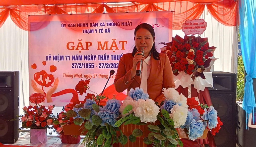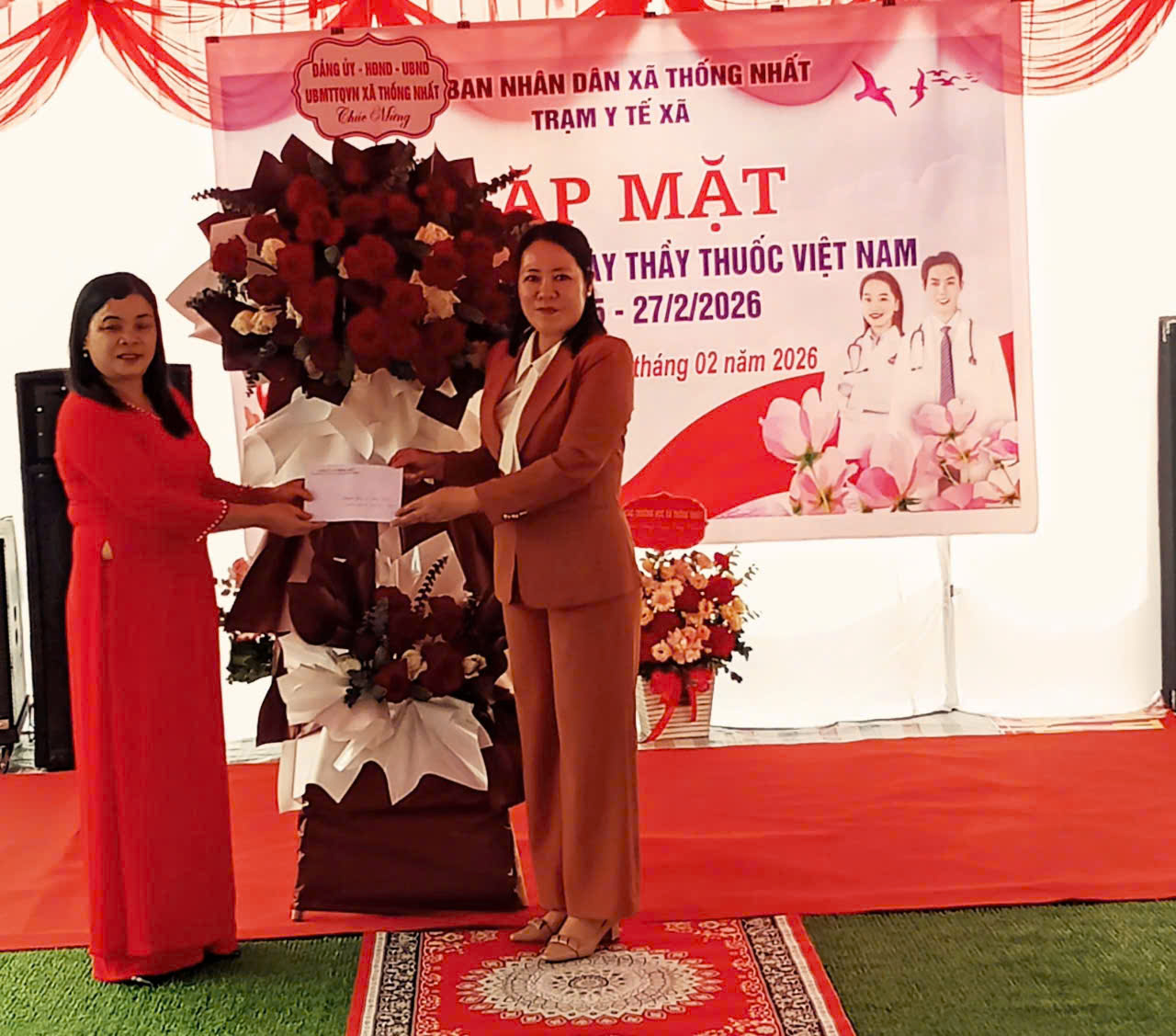 Nhân dịp này thay mặt Đảng uỷ, HĐND, UBND, MTTQ xã đồng chí Lý Thị Thuỷ, Bí thư Đảng uỷ, Chủ tịch HĐND xã đã tặng một Lẵng hoa chúc mừng Trạm y tế xã Thống Nhất, nhân ngày thầy thuốc Việt Nam.