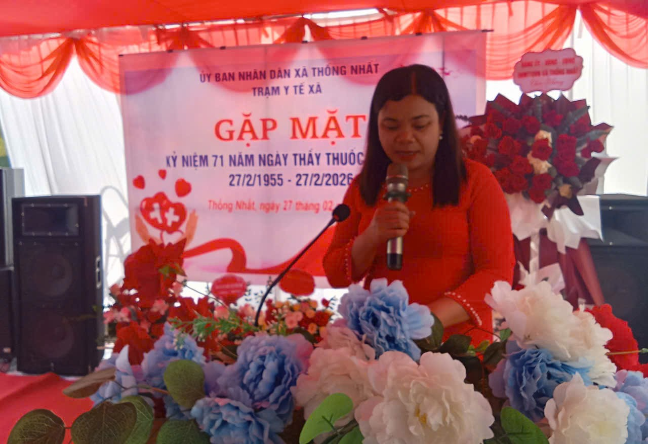 Ngày 27/2/2026, tại Trạm y tế xã Thống Nhất tổ chức Lễ kỷ niệm 71 năm Ngày Thầy thuốc Việt Nam (27/2/1955 - 27/2/2025). Đến dự có đồng chí Lý Thị Thuỷ, Bí thư Đảng uỷ, Chủ tịch HĐND xã; Các đồng chí đại diện lãnh đạo các ban, ngành, địa phương, cán bộ y tế qua các thời kỳ.