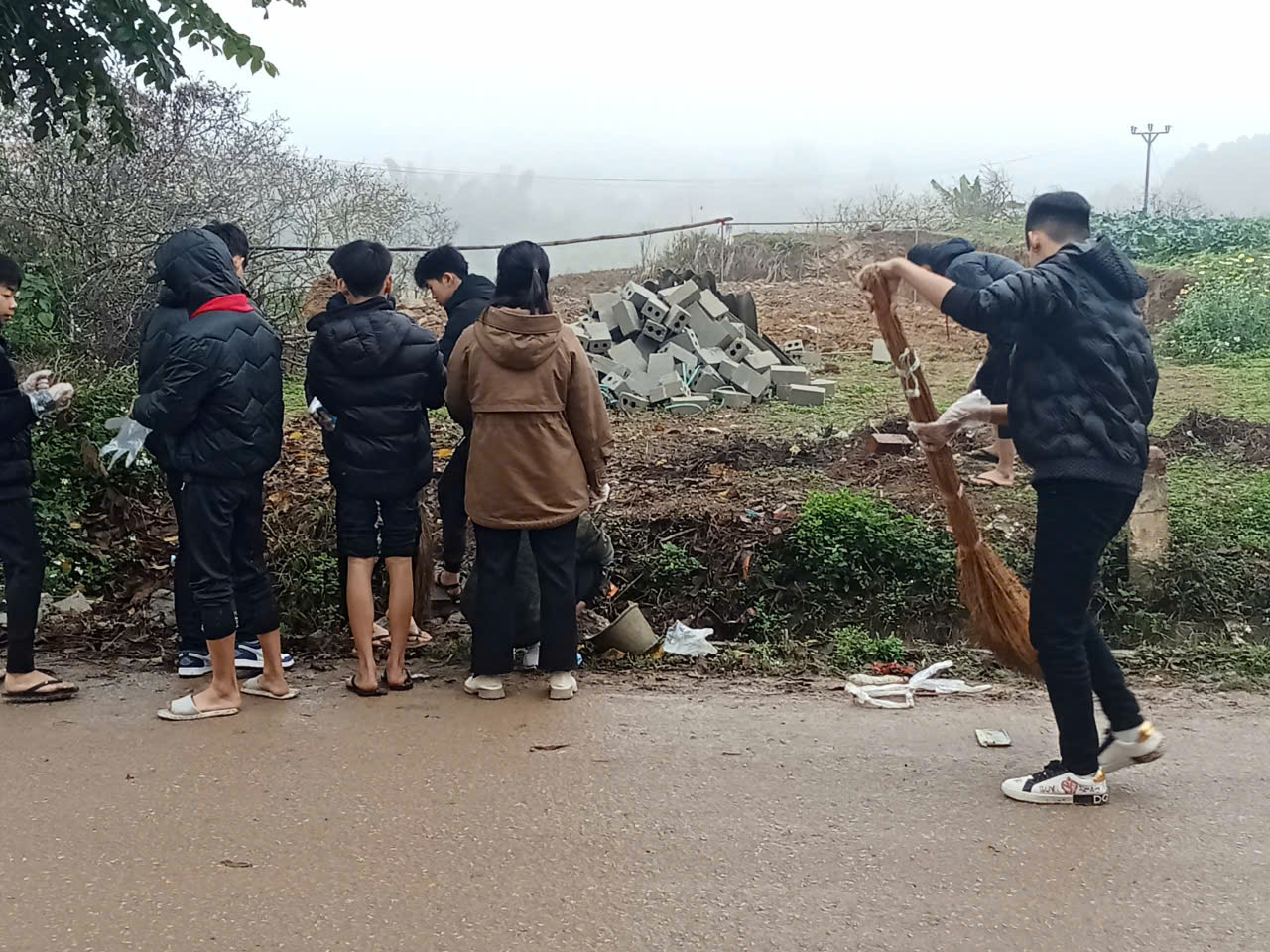 Học sinh quét dọn và thu gom rác thải.