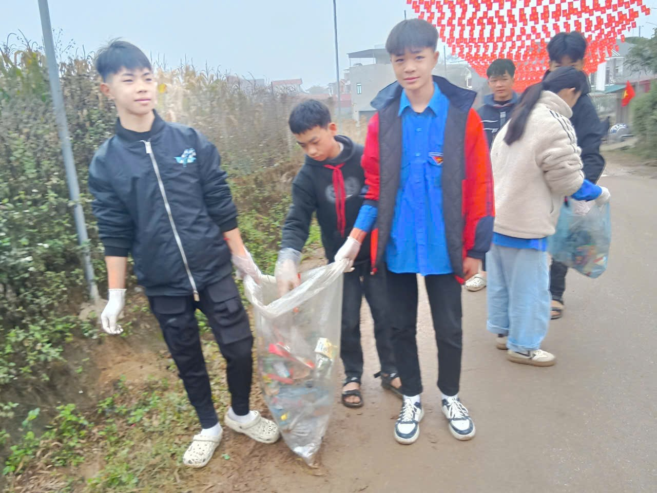Thu góp rác thải trên các tuyến đường chính thôn Khòn Nà.