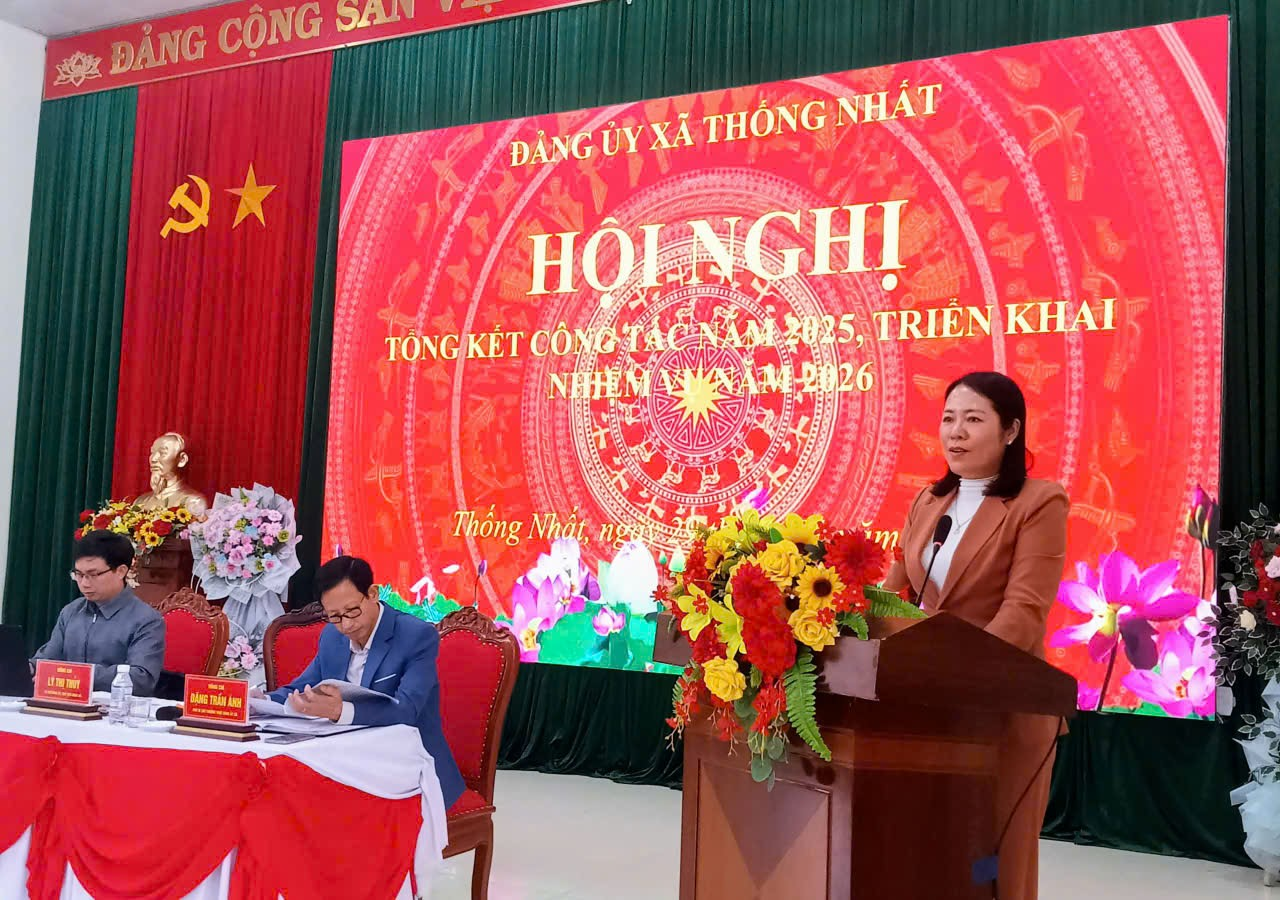 Phát biểu chỉ đạo hội nghị, đồng chí Lý Thị Thuỷ, Bí thư Đảng ủy, Chủ tịch HĐND xã Thống Nhất, ghi nhận và biểu dương những kết quả mà Đảng bộ, chính quyền và Nhân dân xã đã đạt được trong năm 2025. Các chỉ tiêu về phát triển kinh tế - xã hội, xây dựng Đảng, quốc phòng - an ninh, đời sống Nhân dân từng bước được nâng lên. Lĩnh vực phát triển kinh tế gắn với tái cơ cấu sản xuất nông lâm nghiệp, đã khai thác tốt tiềm năng, lợi thế của địa phương…vv. Đồng thời, thẳng thắn chỉ ra những tồn tại, hạn chế cần sớm khắc phục thời gian tới như: Chất lượng một số tiêu chí phát triển chưa bền vững, công tác quản lý nhà nước trên một số lĩnh vực cải cách hành chính, chuyển đổi số chưa đáp ứng yêu cầu thực tiễn. Các nội dung của hội nghị là cơ sở quan trọng để Đảng bộ xã tiếp tục nâng cao năng lực lãnh đạo, sức chiến đấu của tổ chức đảng, phấn đấu hoàn thành thắng lợi các mục tiêu, nhiệm vụ đã đề ra trong năm 2026, góp phần xây dựng xã Thống Nhất ngày càng phát triển ổn định và bền vững, đời sống nhân dân ngày càng được nâng lên.