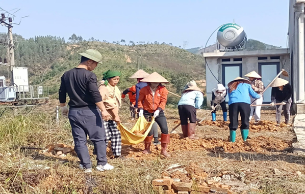 Nhân dân thôn Vinh Tiên thu gom rác tại Nhà văn hoá thôn.