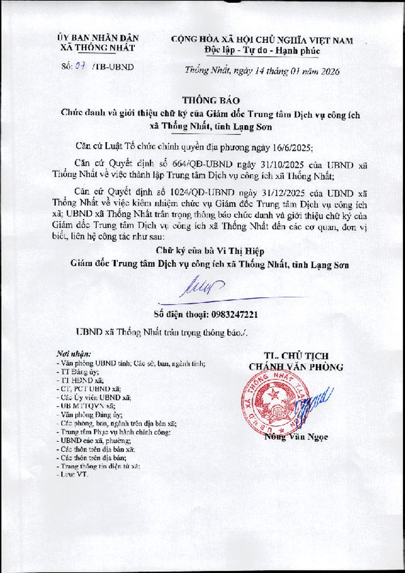 | Tiêu đề văn bản | THÔNG BÁO Chức danh và giới thiệu chữ ký của Giám đốc Trung tâm Dịch vụ công ích xã Thống Nhất, tỉnh Lạng Sơn | ||