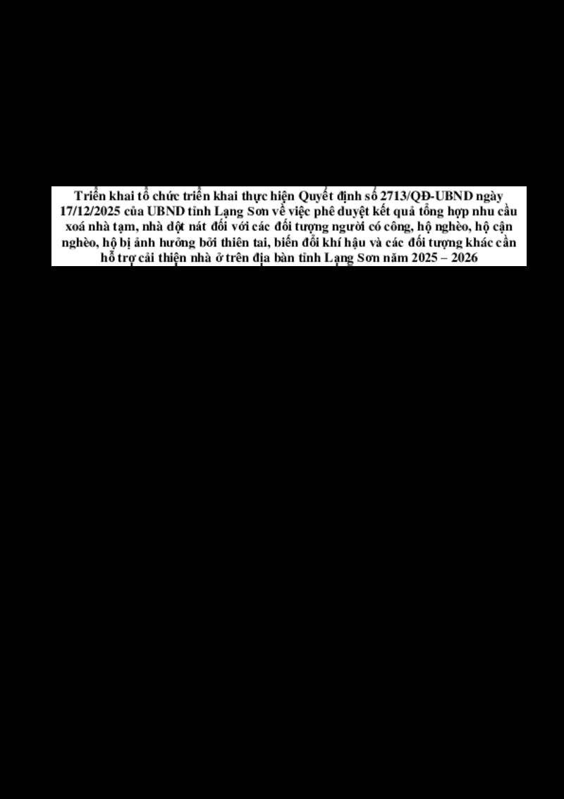 | Tiêu đề văn bản | Triển khai tổ chức triển khai thực hiện Quyết định số 2713/QĐ-UBND ngày 17/12/2025 c nhà dột nát đối với các đối tượng người có công, hộ nghèo, hộ cận nghèo, | ||